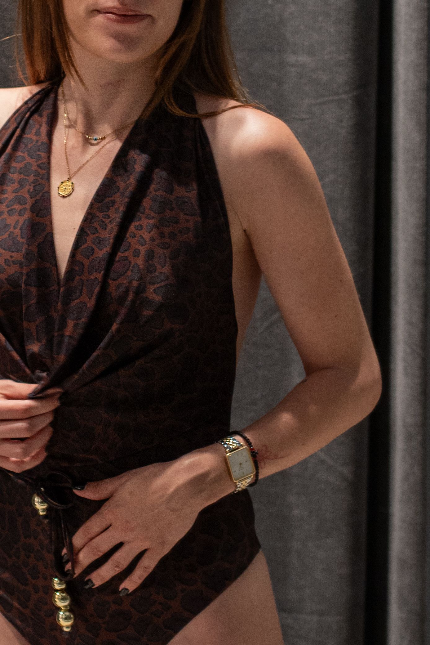 Το ολόσωμο μαγιό από τα καταστήματα Sugarfree με λεοπάρ print και ντραπέ, μεταλλικές λεπτομέρειες στα λουράκια και την ανοιχτή πλάτη, όχι μόνο θα σου χαρίσει εντυπωσιακές εμφανίσεις στην παραλία, αλλά θα γίνει και το go to item για τις εξόδους στο νησί. Μπορεί να συνδυαστεί άψογα το βράδυ με μια μαύρη maxi lace skirt και strappy sandals για ένα chic look αλλά και με ένα jort και φλατ πέδιλα για cool αλλά πάντα εκλεπτυσμένες εμφανίσεις το πρωί.