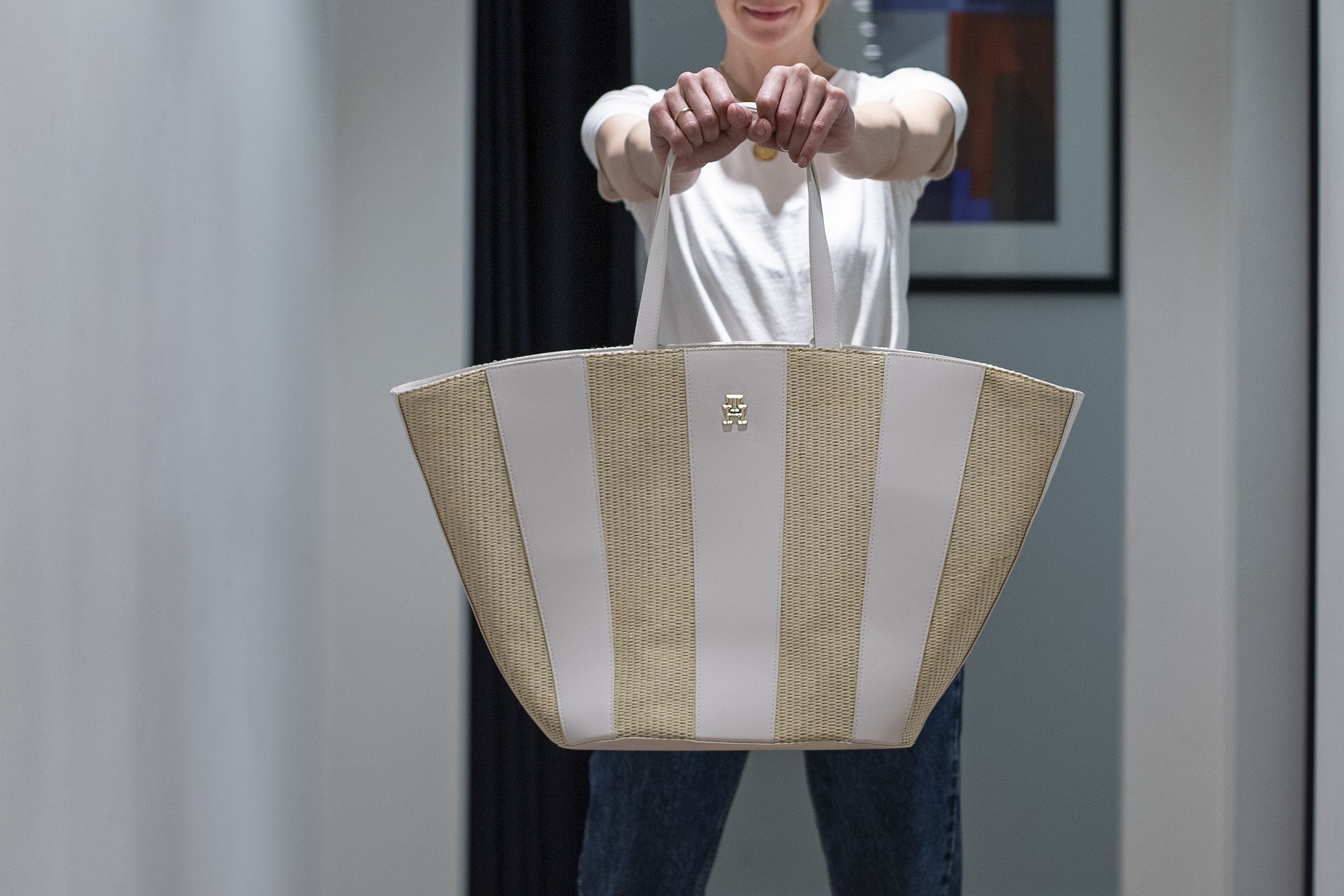 Η πιο πρακτική και σικάτη επιλογή για τσάντα παραλίας είναι μια oversized δερμάτινη με ψάθα. Όσο μεγάλη χρειάζεται για τα απαραίτητα της ημέρας και ικανή να σου κάνει παρέα ακόμα και στο απογευματινό ποτό. Επίλεξε μια σε λευκό χρώμα για όμορφη αντίθεση με το μαύρισμά σου.