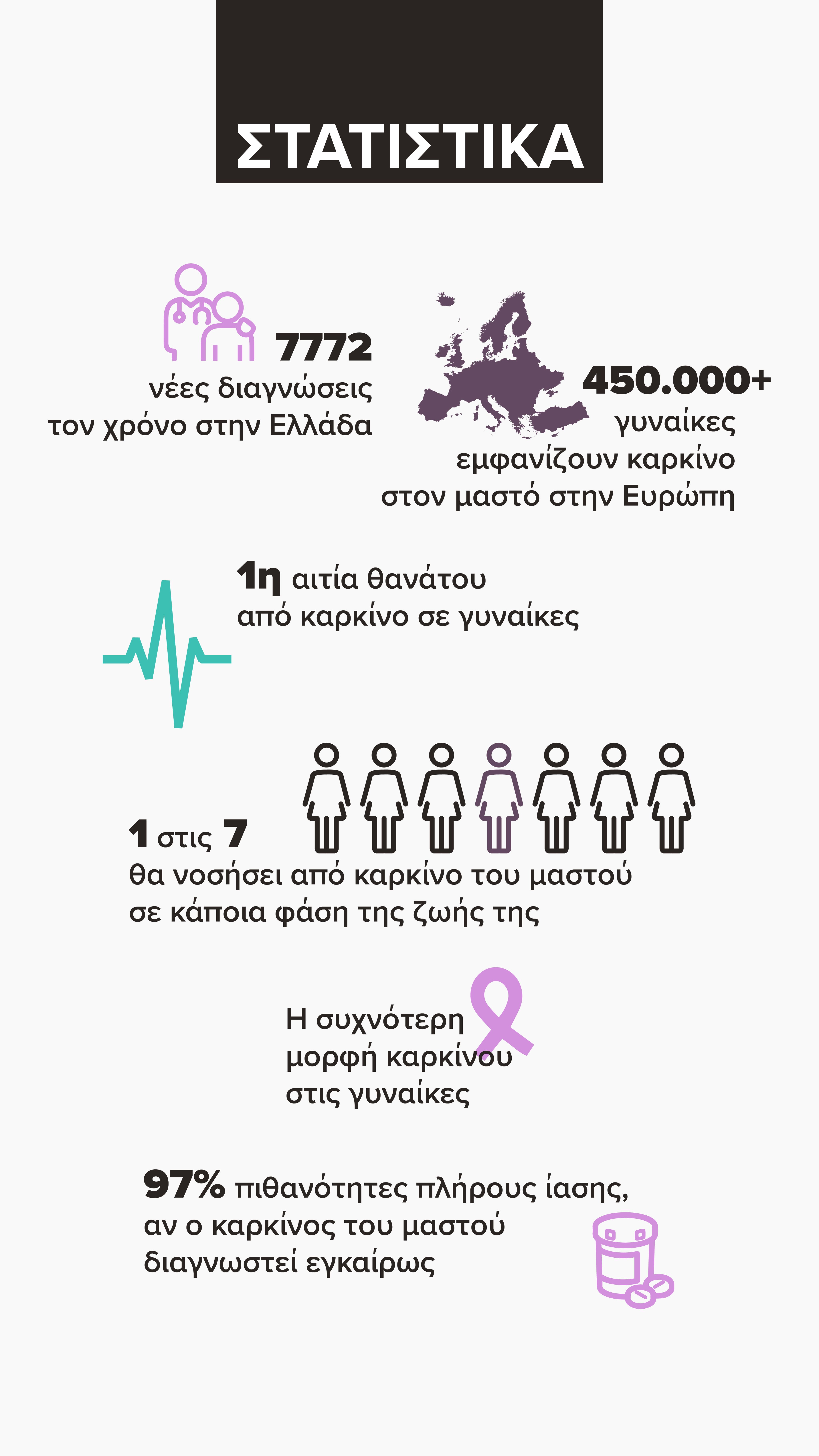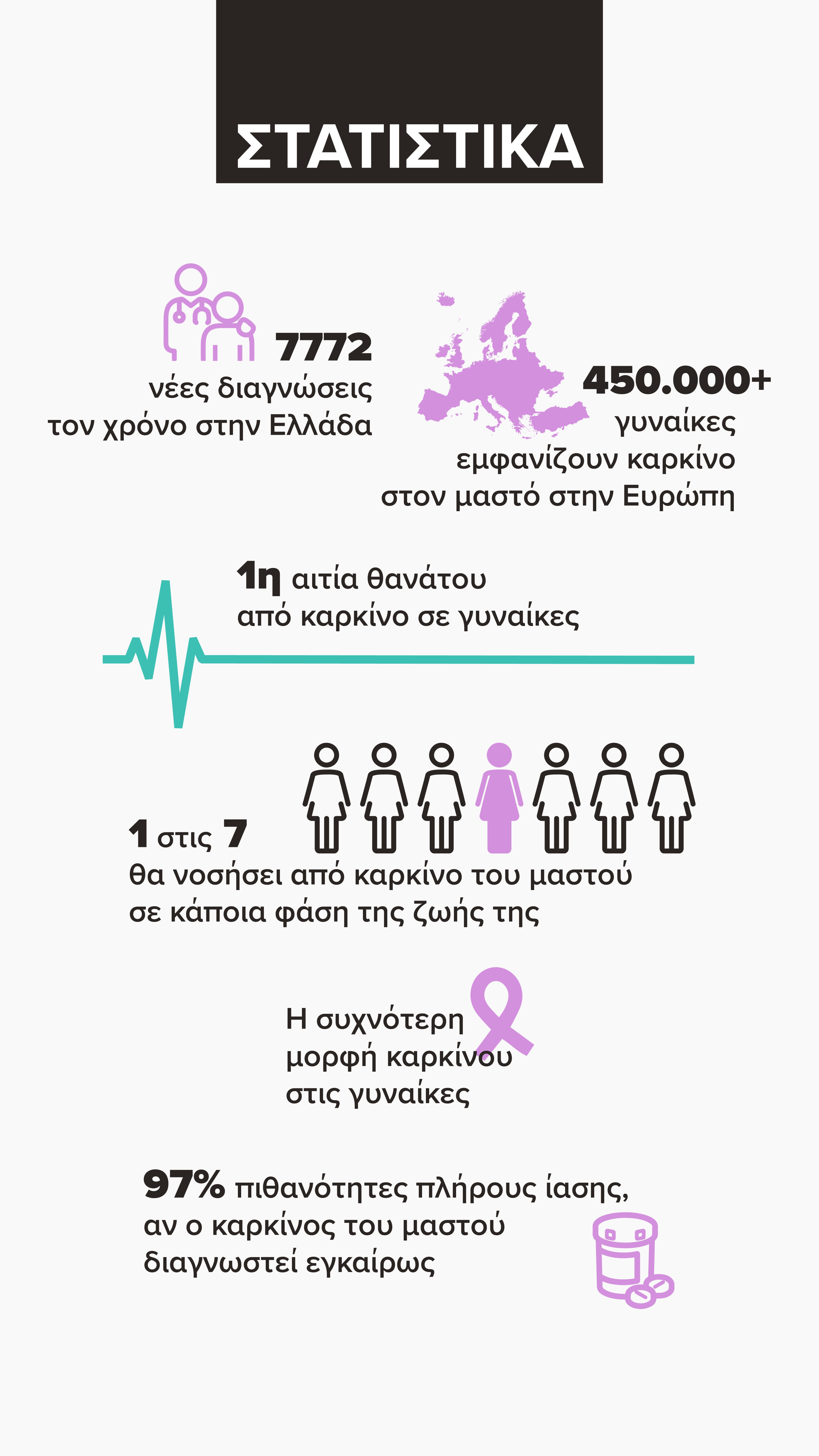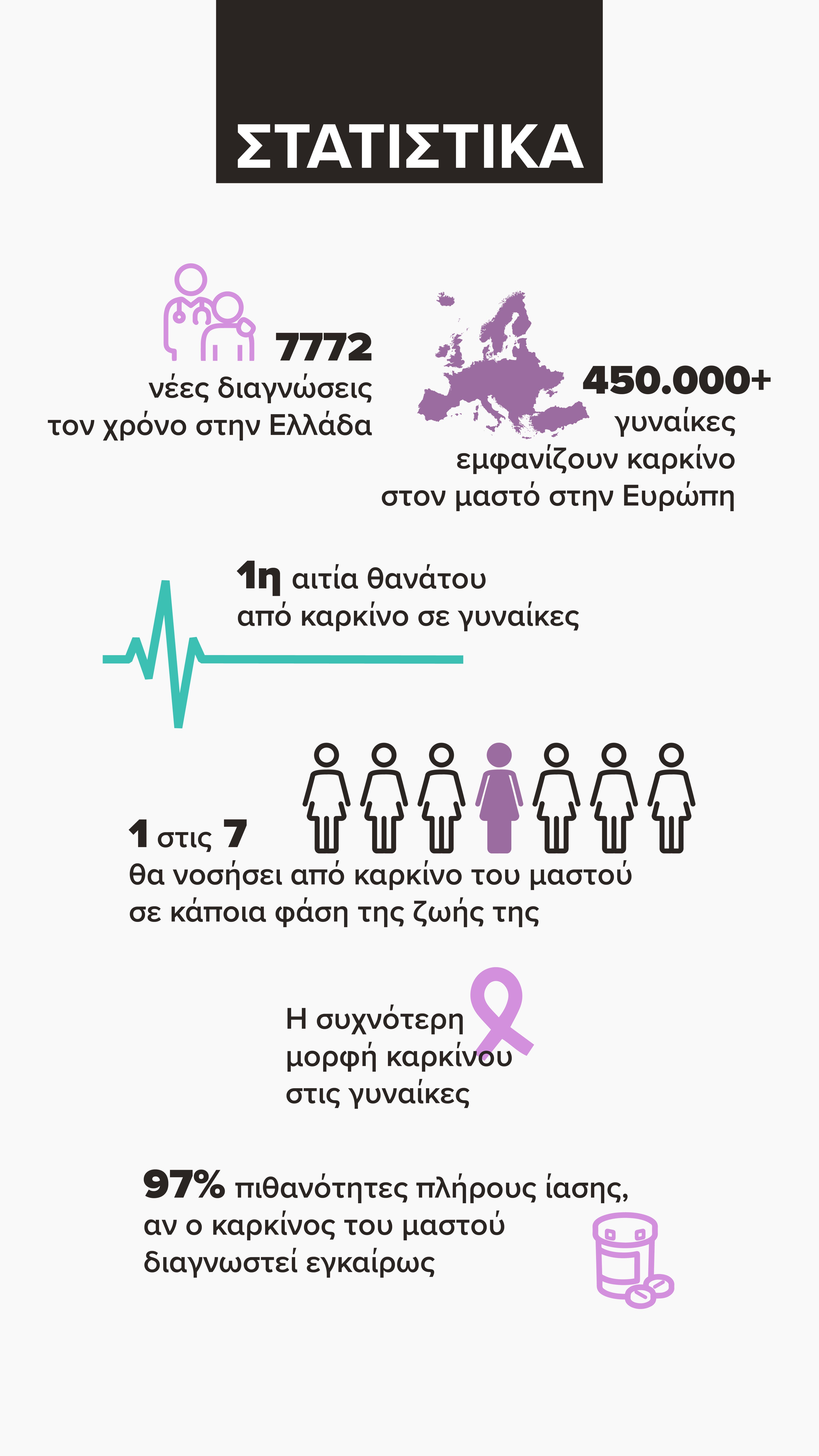 Στην Ελλάδα αναφέρονται 6.000 νέες περιπτώσεις κάθε χρόνο, ενώ υπολογίζεται ότι 1 στις 7 γυναίκες παγκοσμίως θα εκδηλώσει καρκίνο του μαστού κάποια στιγμή στη ζωή της. Και παρότι ο κίνδυνος εμφάνισης της νόσου είναι σχεδόν διπλάσιος για γυναίκες που κάποια συγγενής τους α’ βαθμού έχει διαγνωστεί με αυτήν, το 85% των γυναικών που εμφανίζουν καρκίνο του μαστού δεν έχουν οικογενειακό ιστορικό, παρά οφείλεται σε γενετικές μεταλλάξεις -αποτέλεσμα του σύγχρονου τρόπου ζωής.