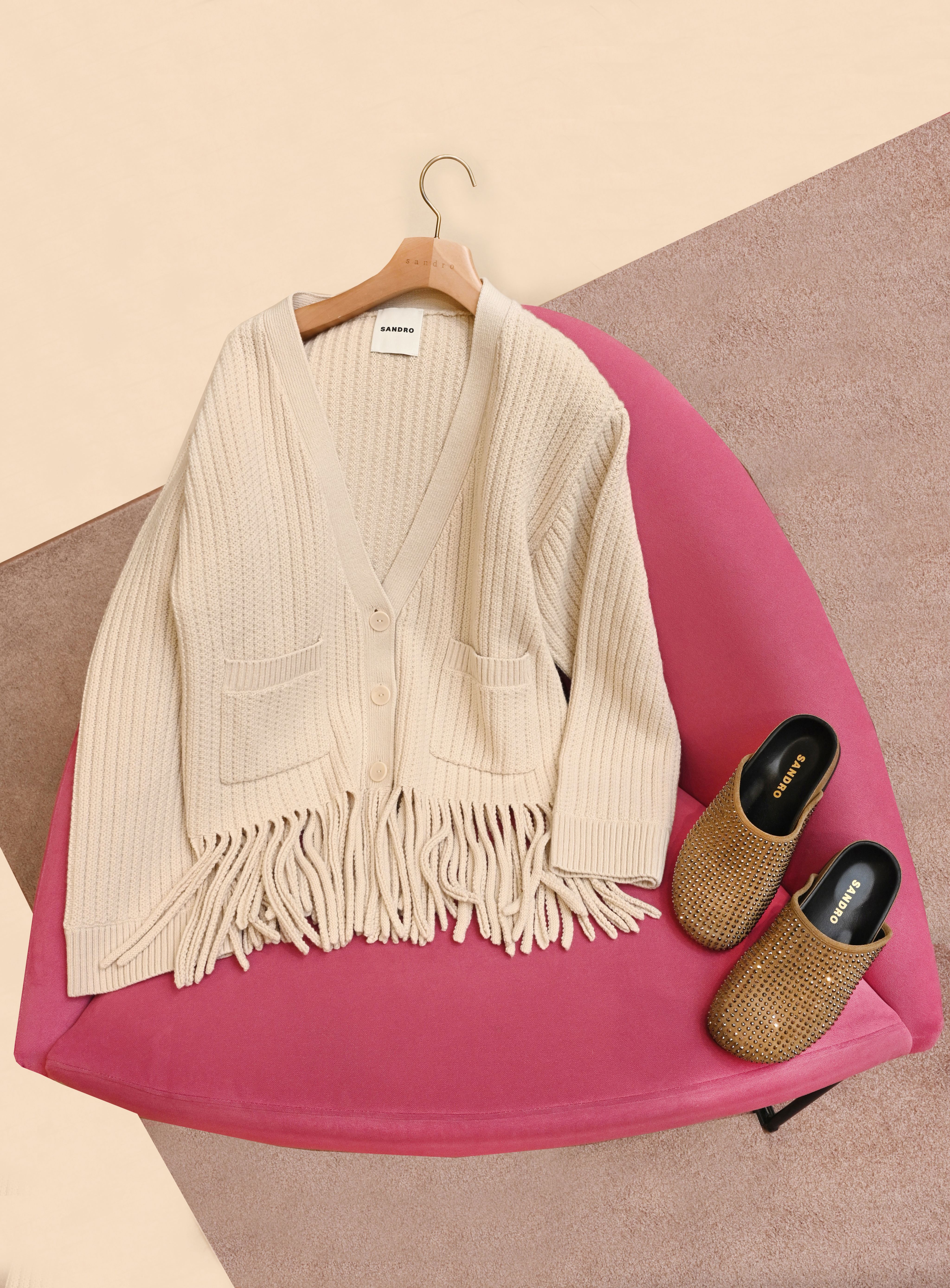 Αγαπάμε το μάλλινο, όμως όταν αυτό συνδυάζεται με μία λεπτομέρεια που το κάνει να ξεχωρίζει ακόμα περισσότερο, τότε δεν έχουμε να σκεφτούμε κάτι. Επίλεξε μία ζακέτα με κρόσσια, στο διαχρονικό εκρού χρώμα, όπως αυτή από Sandro, και συνδύασέ τη, από το καθημερινό τζιν παντελόνι της ντουλάπας σου μέχρι με ένα μαύρο δερμάτινο παντελόνι.