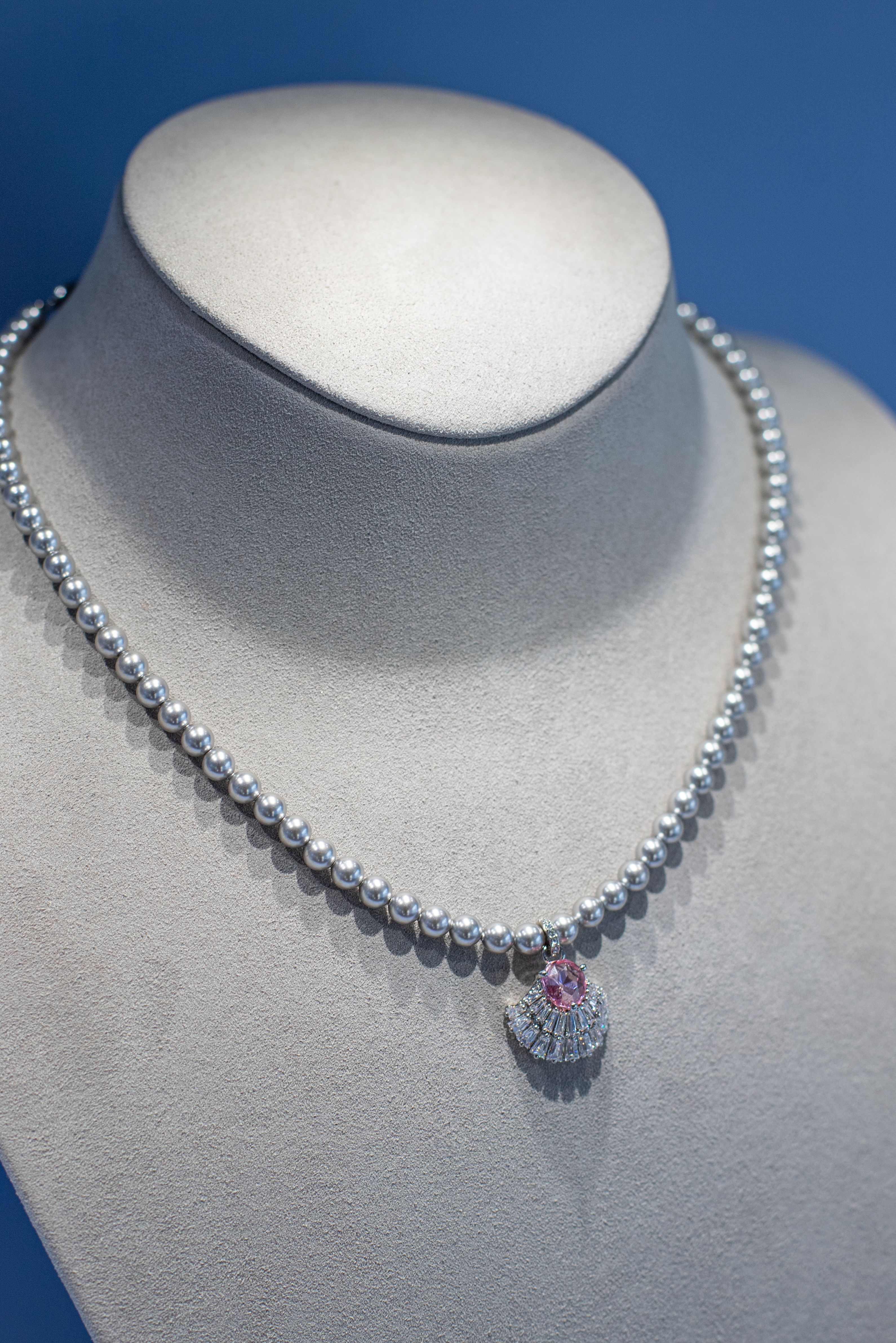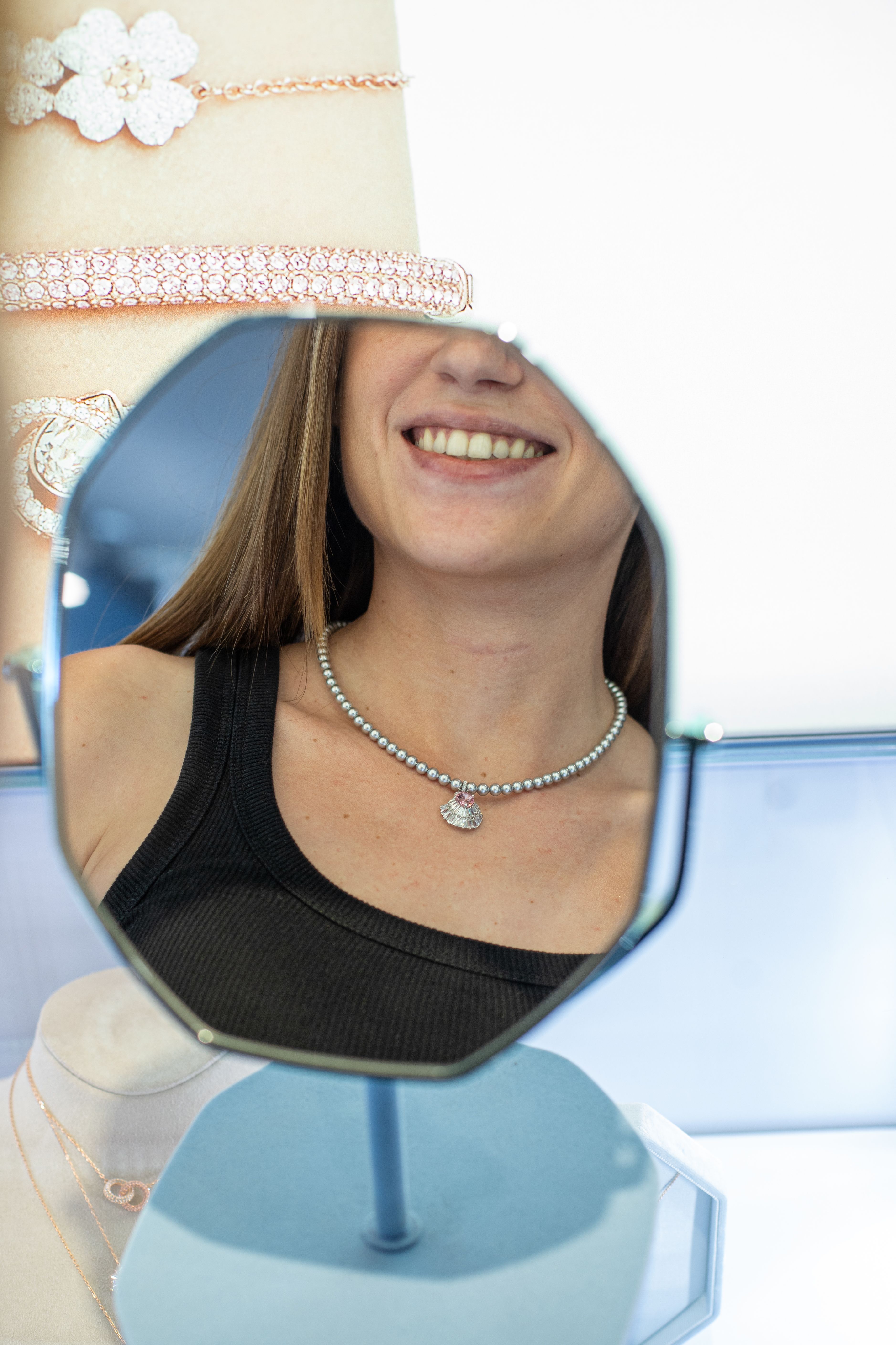 Με λευκόχρυσες χάντρες και ένα charm ανάγλυφο κοχύλι με ροζ και λευκά διαμάντια, το μενταγιόν επιτομή του chic από το κατάστημα SWAROVSKI, θα δώσει μια ρομαντική και άκρως καλοκαιρινή αισθητική στο look σου.