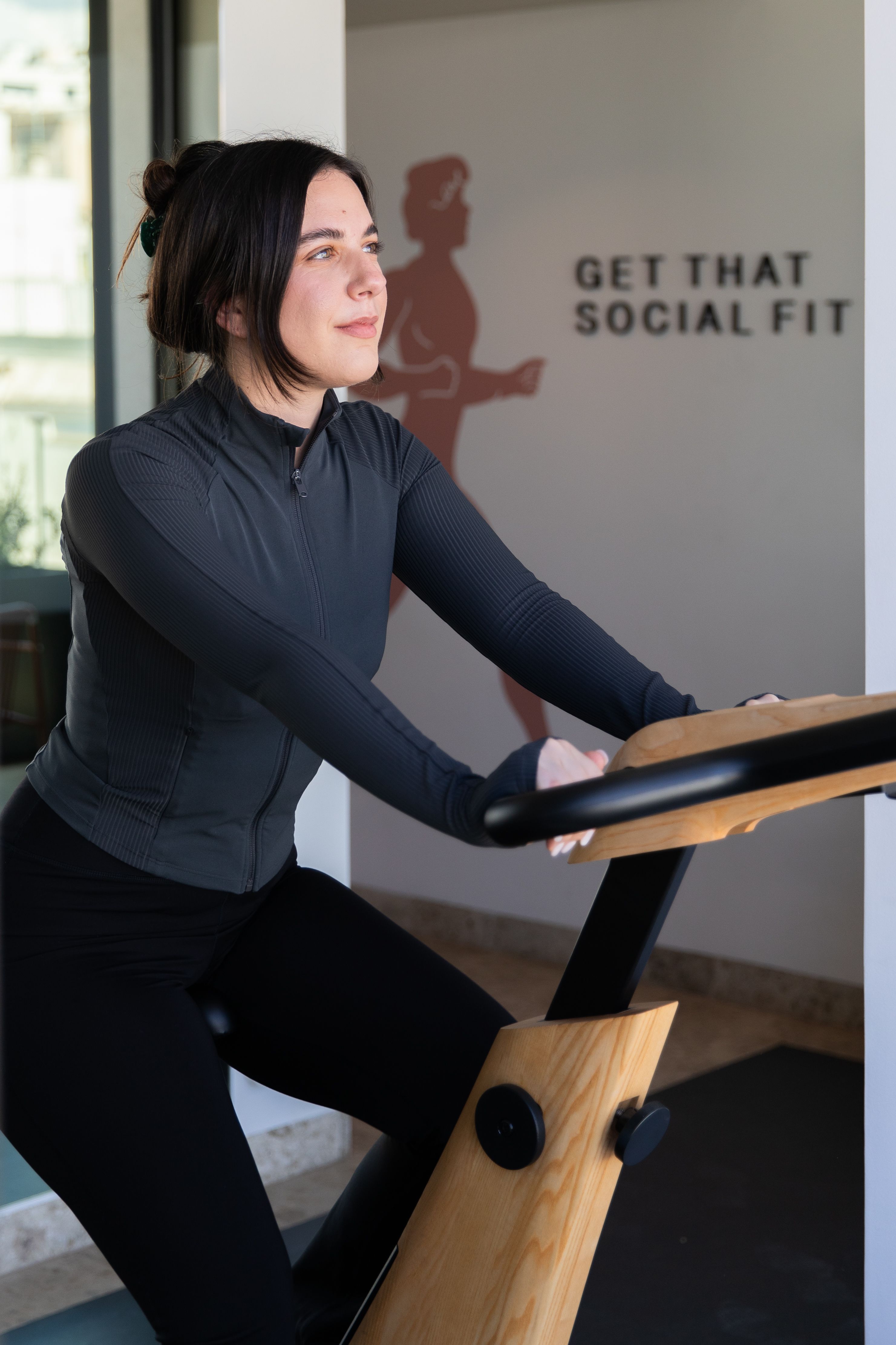 Πήγα από τις σκάλες και άνοιξα ακόμα μία πόρτα. Κανένας κοινότοπος χώρος, με «άχαρα» μηχανήματα. Βαράκια με άμμο, ξύλινο ποδήλατο με αντίσταση αέρα, ξύλινος διάδρομος και θέα στο Κολωνάκι. Δηλαδή, ακόμα και το cardio εκεί φαίνεται πιο ενδιαφέρον.