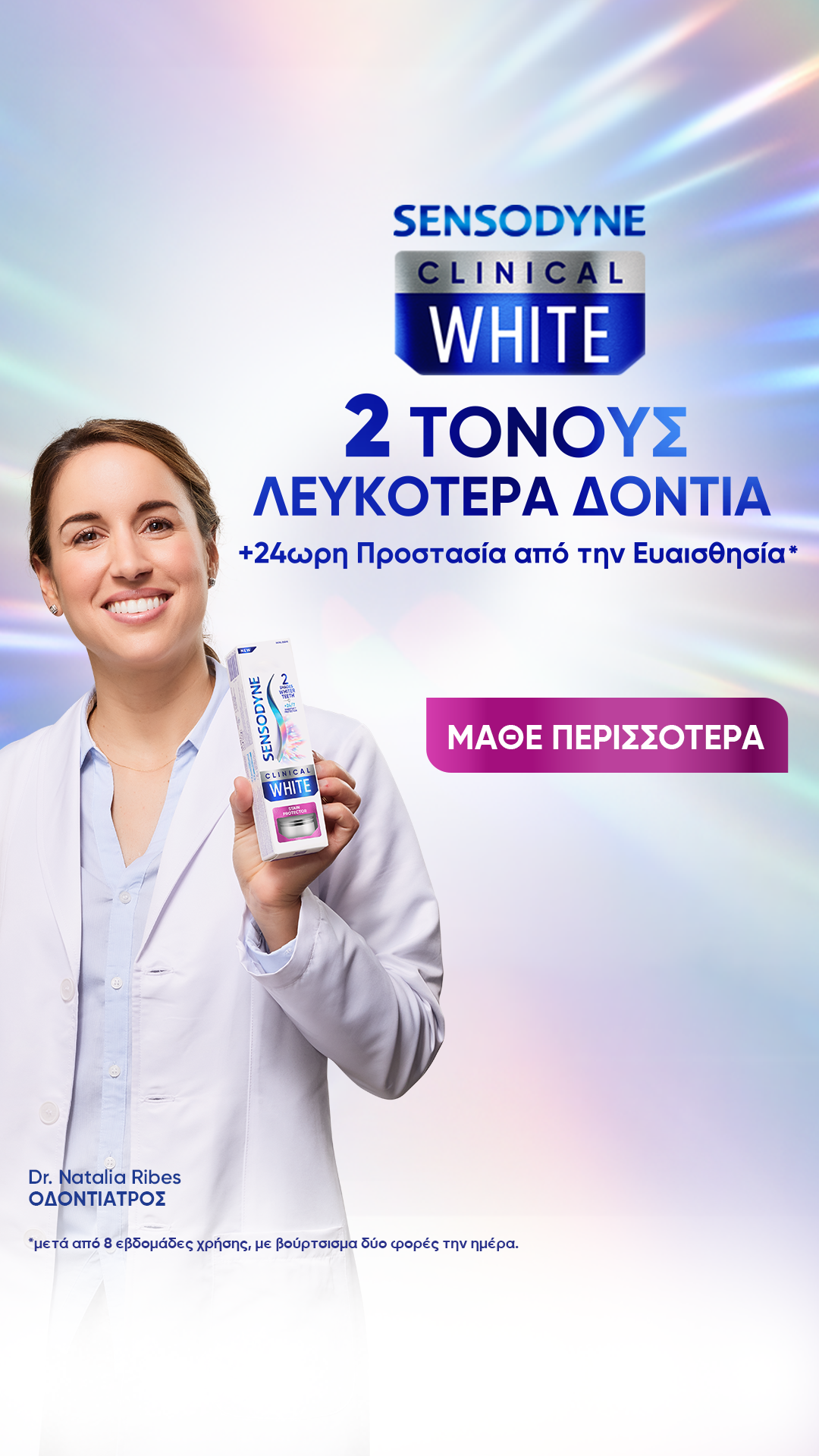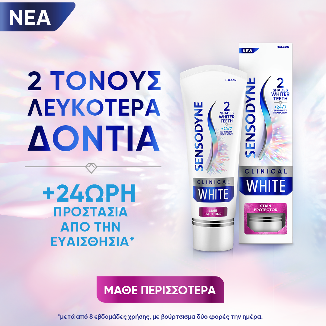 Για τα λευκά χαμόγελα, εμπιστευόμαστε την Sensodyne, κάθε μέρα, πρωί και βράδυ. Είναι άλλωστε ο σύμμαχος μας για υγιή δόντια εδώ και χρόνια, καθώς τη συνιστούν οι οδοντίατροι στην Ελλάδα και εμείς την έχουμε εντάξει στην καθημερινή ρουτίνα φροντίδας μας. Πλέον, με τη νέα Sensodyne Clinical White μπορούμε να έχουμε και δύο τόνους πιο λευκό χαμόγελο, με απόλυτη προστασία από την ευαισθησία.