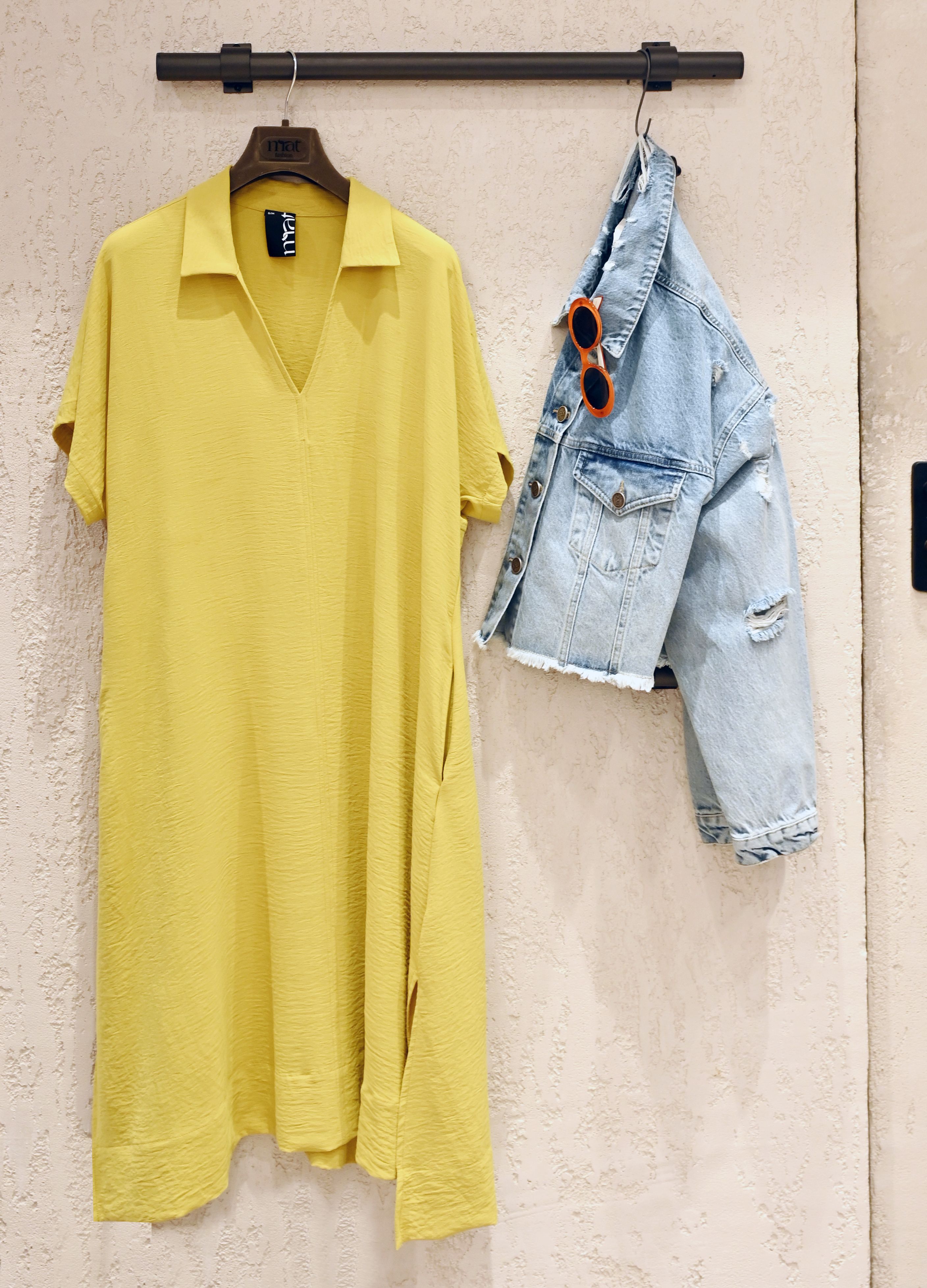 Ένα δροσερό και casual φόρεμα για όλες τις ώρες. Ο γιακάς, το ύφασμα και η γραμμή A το κάνουν ιδανική επιλογή για τα Σαββατοκύριακα. Συνδύασέ το με denim jacket ή oversized blazer σε σκούρο μπλε για να αναδειχθεί καλύτερα το χρώμα του φορέματος. Τα sneakers και τα loafers σετάρονται άψογα μαζί του, ενώ μπορείς να φορέσεις μέχρι και σορτσάκι ή βερμούδα από κάτω.