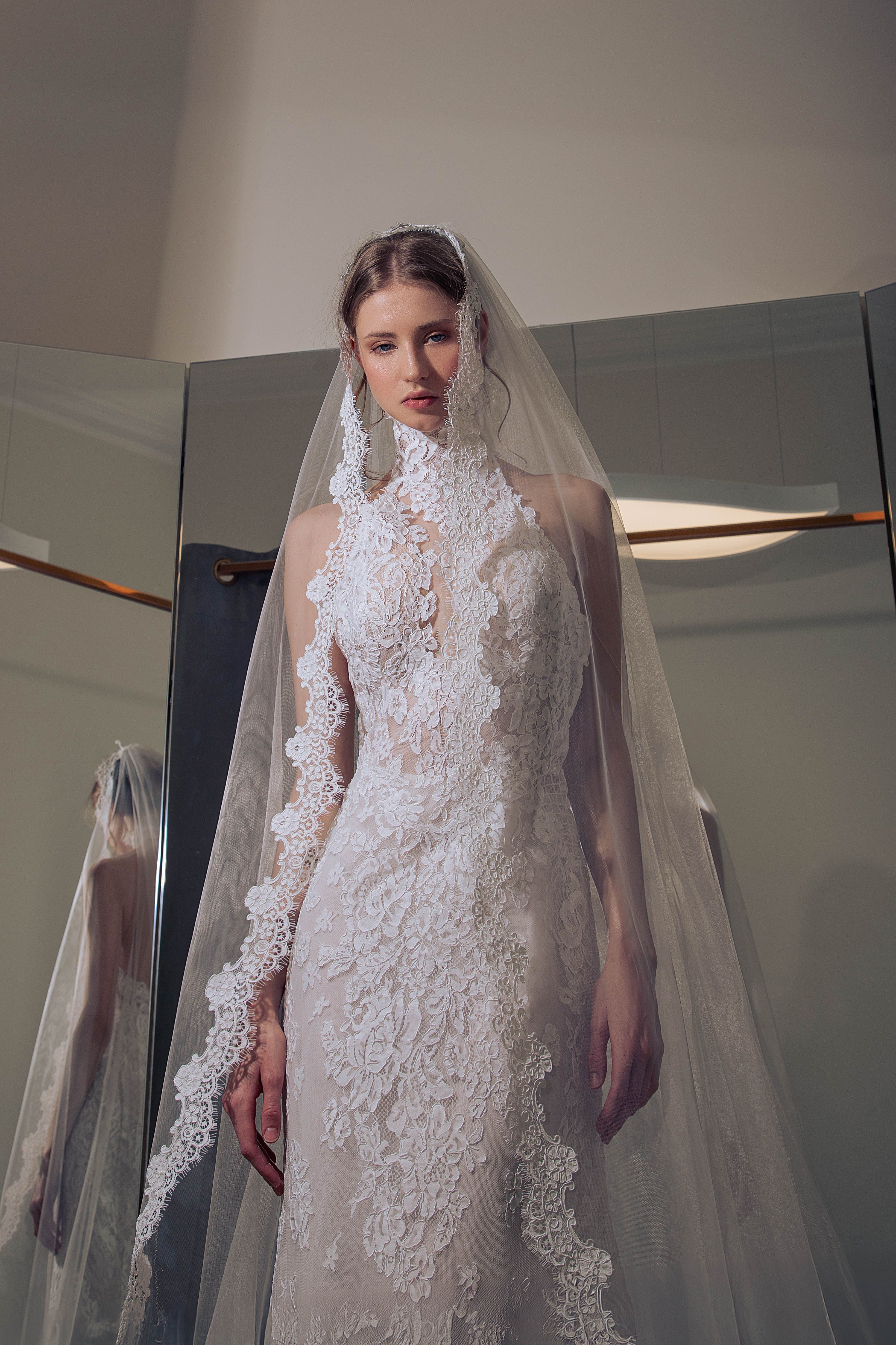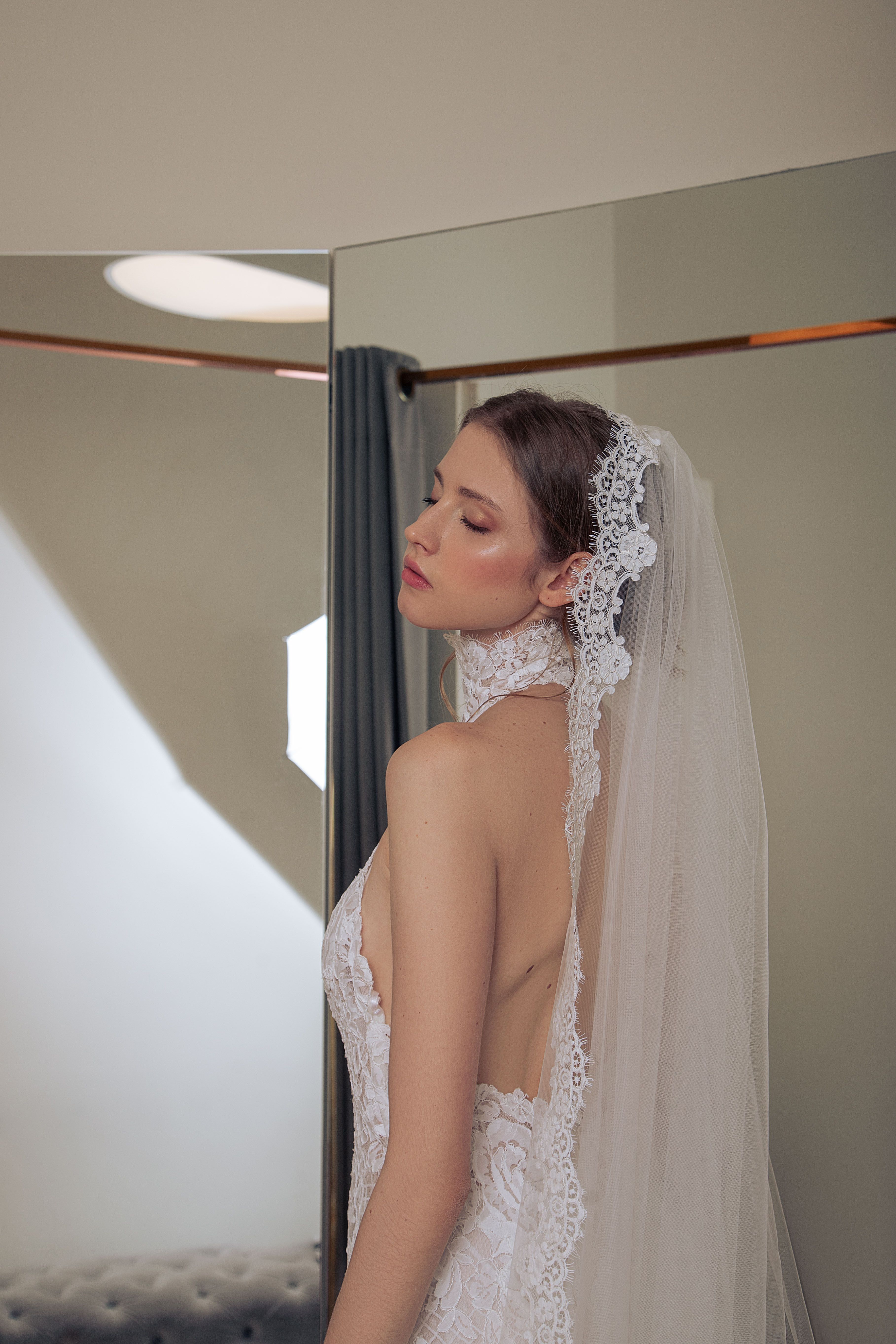 Η δαντέλα αγκαλιάζει αισθησιακά το σώμα. Το πέπλο ακουμπάει πάνω στους γυμνούς ώμους, αφήνοντας την υπόλοιπη σιλουέτα να φαίνεται γοητευτικά πίσω από τα φώτα. Οι καμπύλες αναδεικνύονται μοναδικά, η θηλυκότητα απογειώνεται!