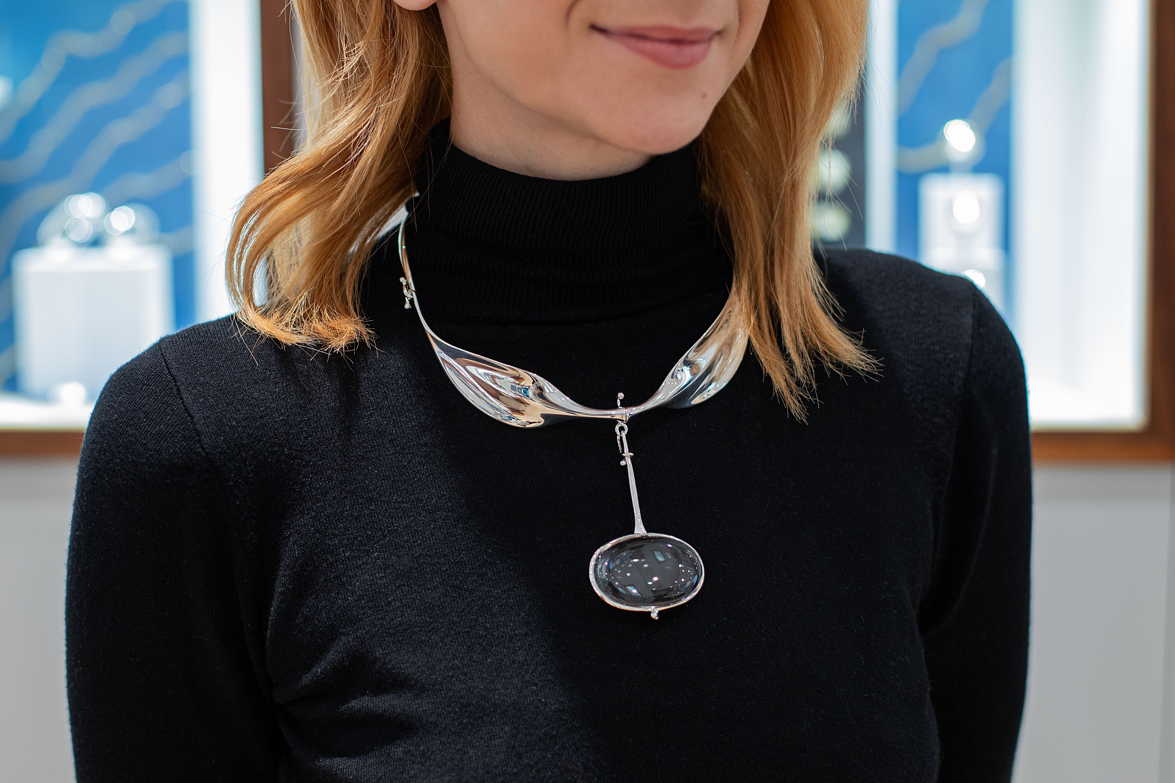 Ένα εντυπωσιακό κολιέ είναι ικανό να τραβήξει τα βλέμματα και να αναβαθμίσει ακόμα και ένα βασικό look. Επένδυσε σε ένα ασημένιο neckring με διάφανο οβάλ κρύσταλλο, το οποίο μοιάζει με δυο φύλλα με μια δροσοσταλίδα να στάζει ανάμεσά τους. Μπορείς να το συνδυάσεις με μαύρο ζιβάγκο φόρεμα ή ακόμα και με λευκό πουκάμισο με αρκετά ανοιχτό ντεκολτέ.