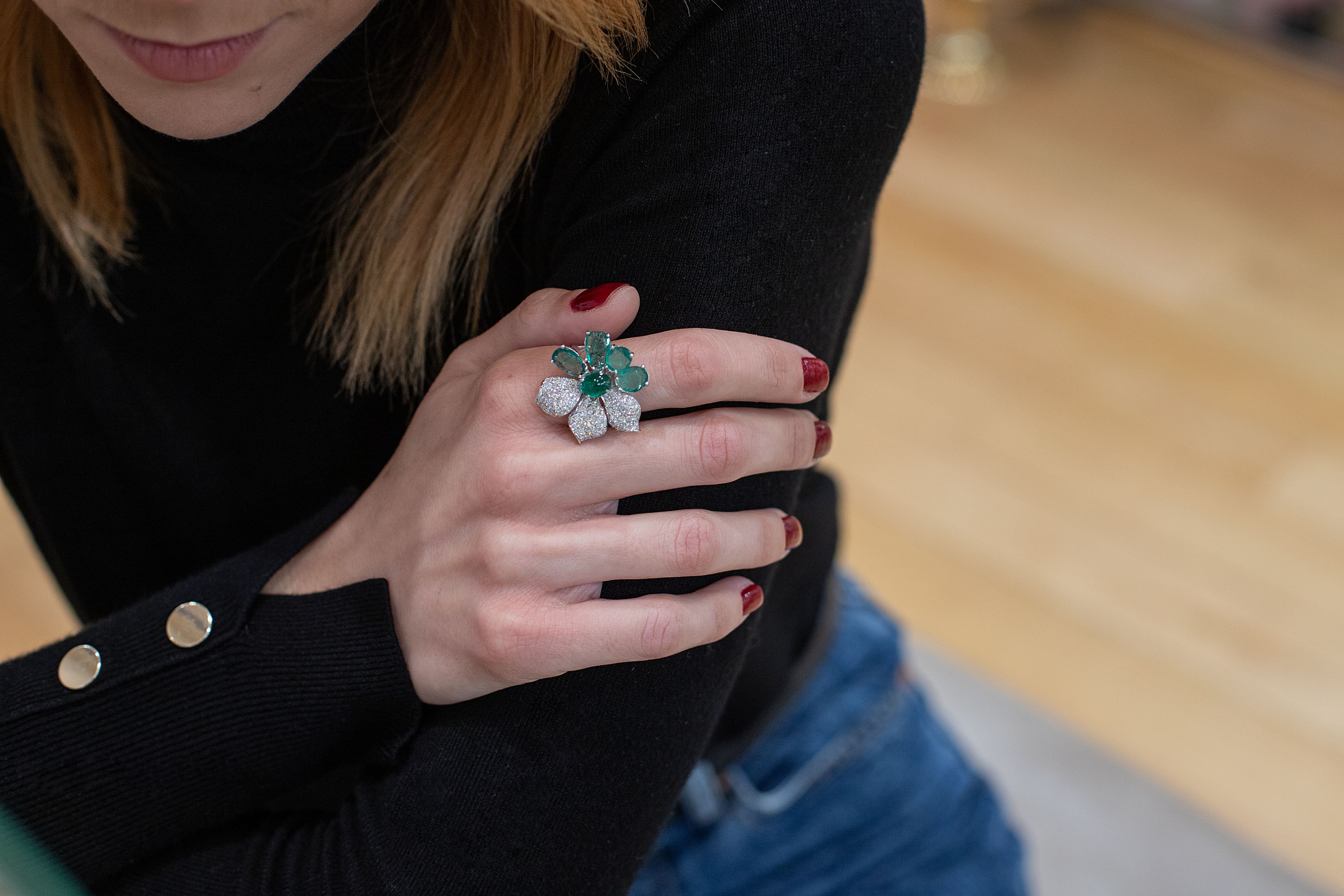 Δώσε λίγο χρώμα στο σύνολό σου με ένα μεγάλο δαχτυλίδι σε σχήμα λουλουδιού από διαμάντια και σμαράγδια. Το πράσινο χρώμα είναι κατεξοχήν χριστουγεννιάτικο και ταιριάζει εξαιρετικά με το βαθύ κόκκινο και το ασημένιο. Για πιο σικάτο αποτέλεσμα βάψε τα νύχια σου σε ουδέτερα χρώματα, όπως το off-white ή το μαύρο.